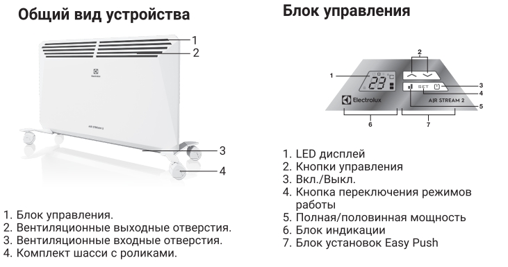 - Электронный блок управления с LED - дисплеем. Легкое и интуитивно понятное управление, точное поддержание заданной температуры, а также возможность возможность сохранять в памяти индивидуальные температурные настройки сделают управление конвектором максимально приятным и комфортным.