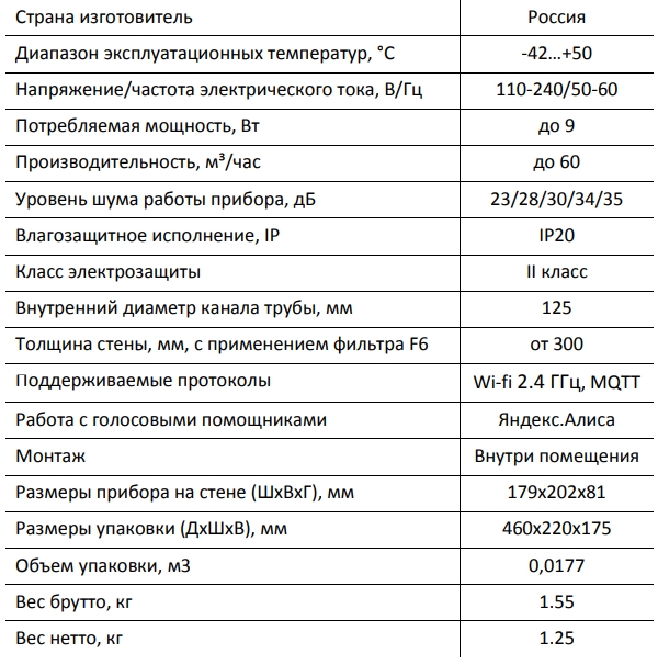 Корпус изготавливается из пластика HIPS c тепло- и звукоизоляцией из эластичного пенополиуретана и изолона. Внутри корпуса прибора размещаются: вентилятор, плата управления, датчики температуры, Wi-Fi модуль. Патрубок из корпуса выведен горизонтально и оснащен уплотнителем из вспененного каучука для герметичного соединения.