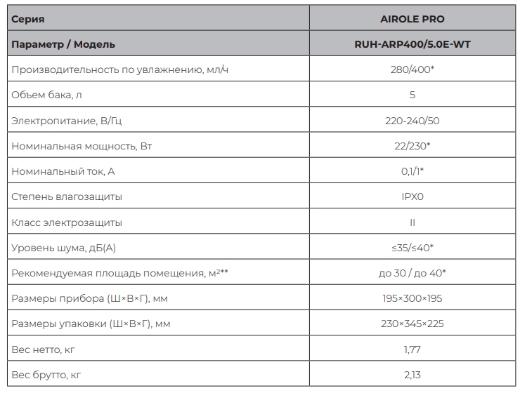 ● Интенсивное увлажнение воздуха до 400 мл в час