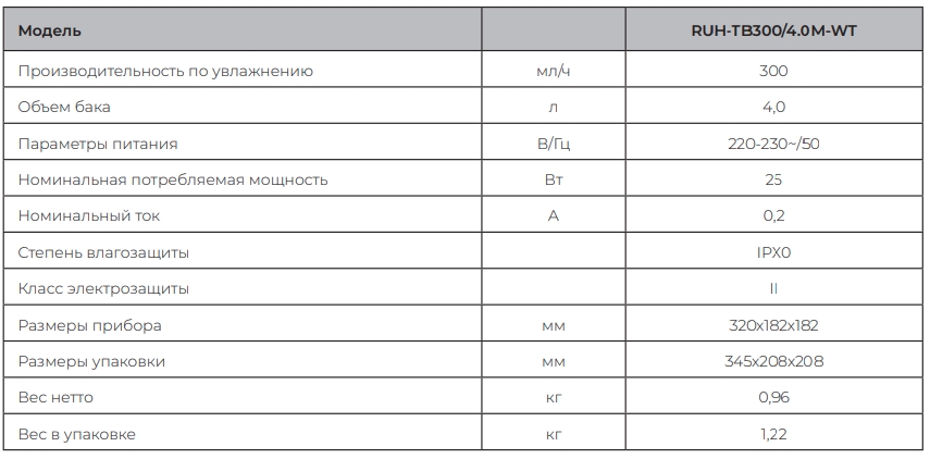 | Производительность увлажнения, мл/ч | 300 |