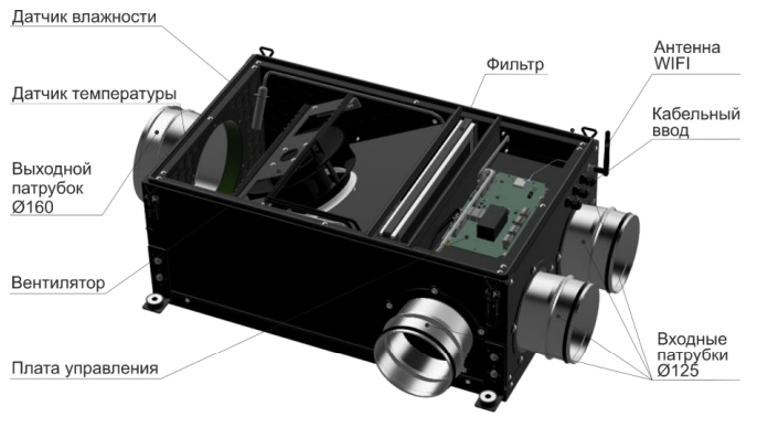 Вытяжная установка представляет собой единый тепло звукоизолированный блок, внутри которого расположен центробежный вентилятор с обратнозагнутыми лопатками и фильтр грубой очистки. Имеется четыре вытяжных канала Ø125мм. Выходной патрубок Ø160мм.