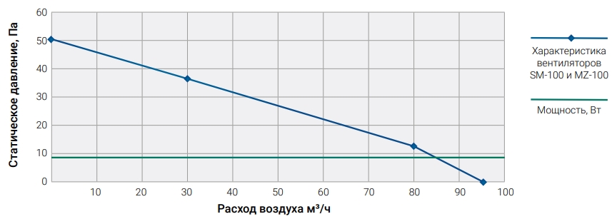 - Высокая производительность. В отличие от большинства вентиляторов с коротким патрубком, вентиляторы Sparkvent обеспечивают расход 95м³/ч и максимальное давление 40Па.